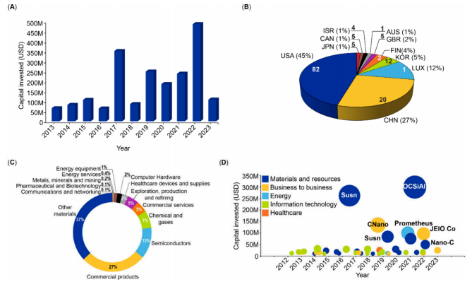圖10. 碳納米管領(lǐng)域的商業(yè)投資關(guān)注度。(A) 2013-2023年碳納米管領(lǐng)域獲得的投資金額趨勢。(B) 2012-2023年碳納米管領(lǐng)域投資資金的地理分布。括號(hào)內(nèi)數(shù)字代表該地理區(qū)域內(nèi)的相關(guān)企業(yè)數(shù)量。(C) 2012-2023年碳納米管領(lǐng)域投資資金在主要產(chǎn)業(yè)類別間的分布情況。(D) 2012-2023年碳納米管領(lǐng)域按主要產(chǎn)業(yè)部門分類的前50大交易。