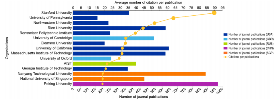 圖3. 以單篇文獻(xiàn)平均被引次數(shù)計(jì),碳納米管相關(guān)研究領(lǐng)域領(lǐng)先的研究機(jī)構(gòu)。數(shù)據(jù)涵蓋2003年至2023年間CAS內(nèi)容集中的期刊文獻(xiàn)。