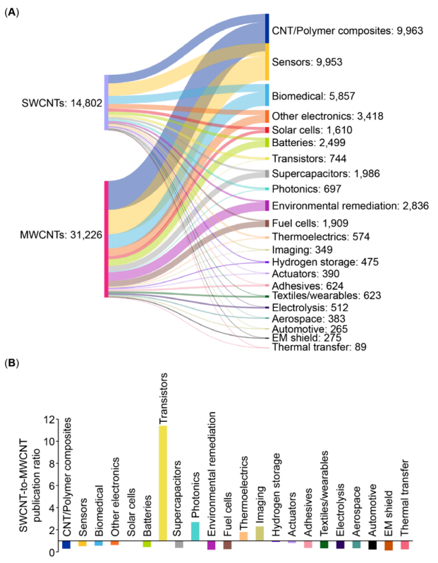 圖6.(A)單壁碳納米管與多壁碳納米管在不同選定應(yīng)用中的共現(xiàn)關(guān)系。(B)部分選定應(yīng)用中單壁碳納米管與多壁碳納米管相關(guān)文獻(xiàn)的數(shù)量比值。數(shù)據(jù)來源于CAS內(nèi)容集2003-2023年碳納米管領(lǐng)域的期刊與專利文獻(xiàn)。