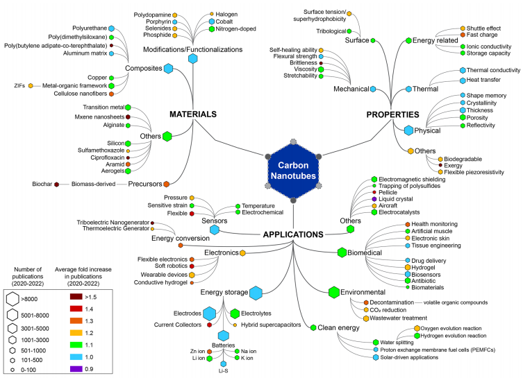 圖7. 通過對超過26.5萬份文獻(xiàn)進(jìn)行NLP分析生成的碳納米管出版物新興概念“趨勢全景圖”。每個(gè)節(jié)點(diǎn)的尺寸和顏色分別表示2020至2022年間相關(guān)文獻(xiàn)的總數(shù)量及相對增長率。