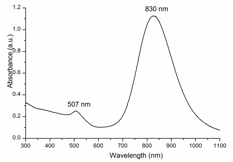 紫外-可見-近紅外光消光譜呈一低、一高的雙峰峰型:在505~510之間存在一個弱吸收峰,