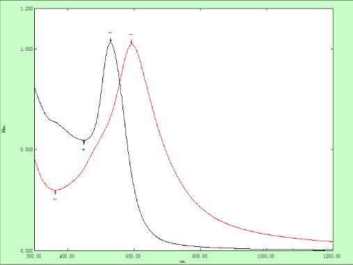 圖示: 檸檬酸鈉穩(wěn)定的金納米殼(紅色譜線,峰位置:592 nm)和檸檬酸鈉穩(wěn)定的金納米球(40 nm,峰位置:530)光譜的對(duì)比圖