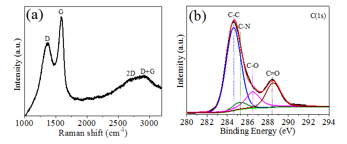Fig. 2 (a) Raman spectrum of the GQDs. (b) XPS spectrum of the GQDs.