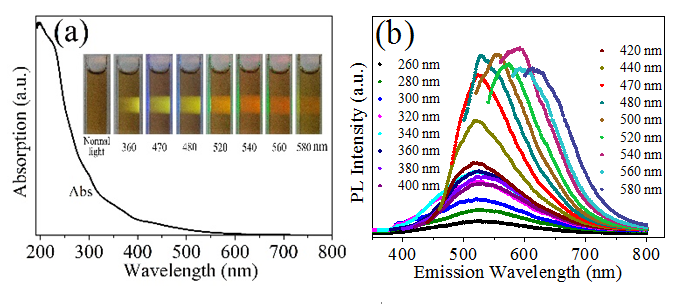 Fig. 3(a)UV-vis absorption spectrum of the GQDs at different excitation wavelengths. Inset: Optical photograph of the GQDs dispersed in water under different wavelengths irradiation. (b) PL spectra of the GQDs at excitation wavelengths from 260 to 580 nm.