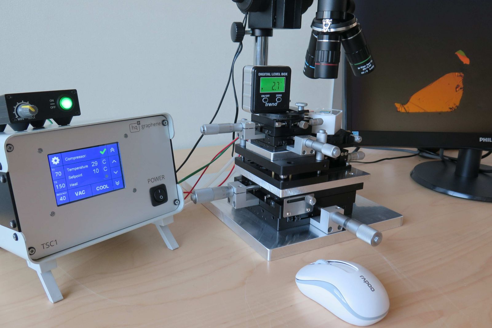 The manual transfer system contains all the required elements for the fabrication of a high quality 2D heterostructure and also twisted graphene (manual rotation stage with 0.015 degrees resolution): A high resolution optical microscope with CCD camera, mechanical stage, vacuum chuck which can be heated up to 200C.