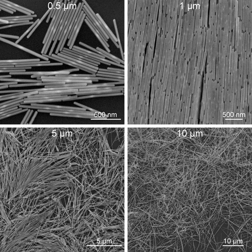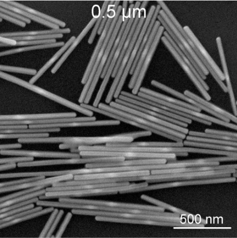 長銀納米棒是由金納米雙錐生長而成的,目前提供4種長度:~0.5微米、~1微米、~5微米、~10微米,它們的直徑介于~40納米至~70納米之間。這些長銀棒保存在~0.01 M CTAC (cetyltrimethylammonium chloride,一種表面活性劑)中,它們基本不含其它的顆粒雜質(zhì)。這些長銀棒在嚴(yán)格控制的條件下合成,每一批樣品都會利用電子顯微鏡進(jìn)行嚴(yán)格地檢查。